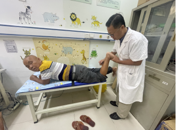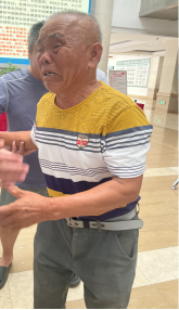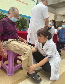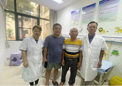 75岁的陈大爷是此次义诊的受益者之一。常年务农的他因左侧膝关节剧痛,近一个月连下蹲、走路都困难,只能靠拐杖行动。经海医一附院康复医学科张敬主任医师、深圳市龙岗区中心医院蔺勇主任医师团队评估,确诊为“鹅足肌腱炎合并小腿筋膜紧张”。专家现场为其开展筋膜刀松解治疗。20多分钟后,陈大爷欣喜地发现疼痛明显缓解,不仅能独立站立行走,还能轻轻下蹲。“太感谢了!真的是给百姓办实事!”他拉着专家的手激动落泪,家属还特意与团队合影留念,这一幕成为当天义诊现场最温暖的画面。