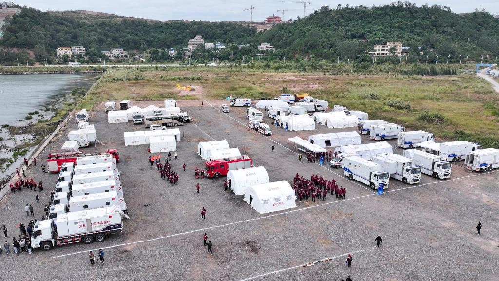 演练中,海南救援队队员展现出扎实的专业功底与高效的协作能力。从快速现场评估、规范检伤分类,到配合搭建移动医院、参与伤员转运,每个环节都衔接顺畅。在移动医院内,救援人员实施了剖腹探查、肝脏损伤修补、海水浸泡伤清创、脾破裂切除、脑出血颅脑钻孔及下肢损毁截肢等高难度手术,充分展现了跨区域协同救援的高水平专业能力。