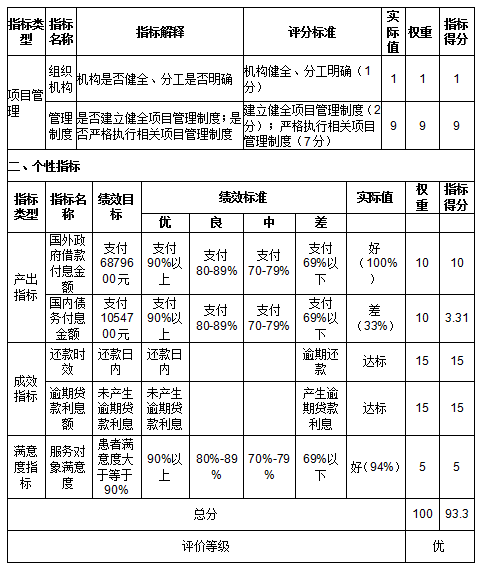 综合评价情况及评价结论:国内债务付息指标预算数与实际执行数有出入导致产出指标扣分,但我院该项目严格按合同执行,预算与执行的出入是由于按时按期归还本金后计算利息基数的减少以及市场利率的浮动造成的,可酌情加分,故综合评价总分95分,评价等级优。