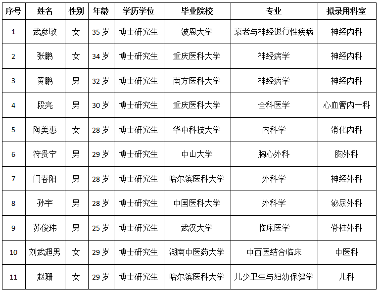 人才招聘 首页 > 医院动态 > 人才招聘 > 正文 公示 作者:日期: 2025-12-26浏览: 因工作需要,经医院院长办公会及党委会讨论决定,拟录用武彦敏等11人到我院工作,现将有关情况予以公示,如有异议可向医院纪检部门反映。 公示期:2025年12月26日至2026年1月4日(5个工作日) 咨询电话:0898-66716462 李老师、符老师 纪检监督电话:0898-66701053 海南医科大学第一附属医院 人力资源部 2025年12月26日