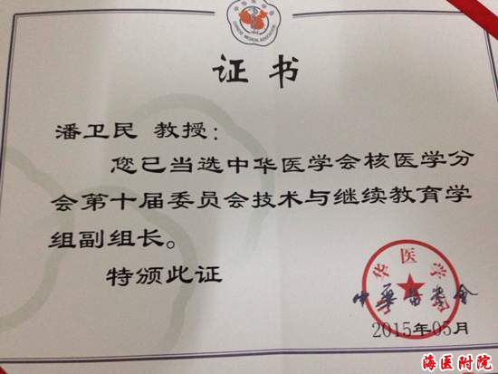 2015年5月3-6日,中华医学会核医学分会2015年全国核医学学术年会、第六次青年核医学学术交流会、第三次中美核医学学术交流会在上海胜利召开。我院核医学科潘卫民主任和肖欢副主任医师参会。会议期间,中华医学会核医学分会第十届科普与继续教育学组成立,我院核医学科潘卫民主任当选为新一届的科普与继教学组副组长。这是潘卫民主任继去年十月当选中华医学会核医学分会全国委员(以海南省核医学分会候任主委)后,再次当选中华医学会全国专业分会学组的副组长,标志着我院核医学科的科普继教工作得到全国同行的认可。同时,会议期间,还选举产生了第十届中华医学会核医学分会青年委员会,肖欢副主任医师当选青年委员。