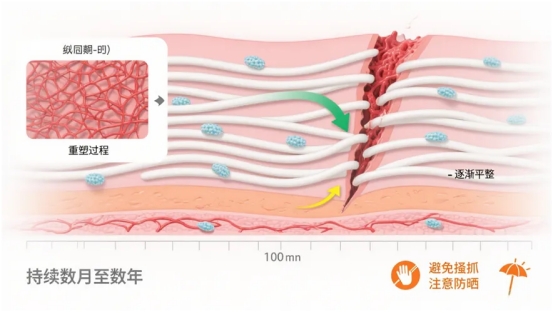 四、重塑期:增生期结束后进入重塑期。胶原蛋白等细胞外基质不断被重塑和调整,使伤口的强度和弹性逐渐恢复,这一过程可能持续数月甚至数年,具体时间取决于伤口的大小和深度。此阶段,伤口外观会逐渐变得平整自然。患者需注意避免搔抓,做好防晒。