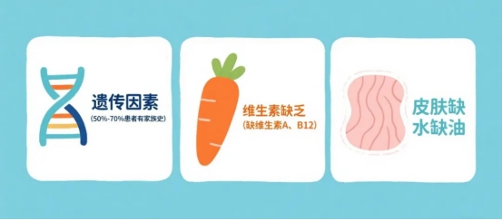 2、维生素缺乏:缺乏维生素A、维生素B12等,会影响皮肤正常代谢,导致毛囊口的角质性物质难以脱落,进而堆积形成“小疙瘩”。