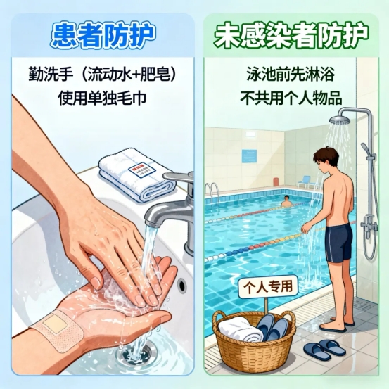 ①去公共泳池、温泉后,赶紧冲个澡,减少病毒残留;