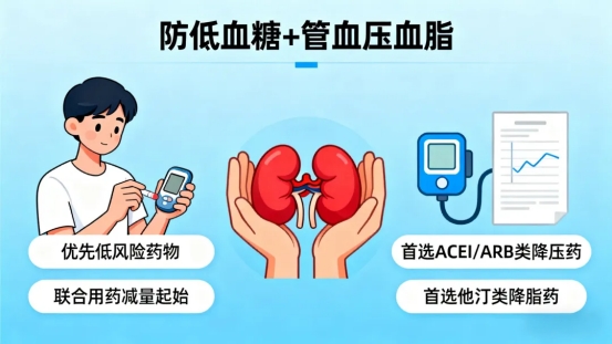 ③同步管理血压、血脂:高血压(首选ACEI/ARB类药物)和高血脂(首选他汀类药物)会加速肾损伤,需与降糖治疗同步推进。