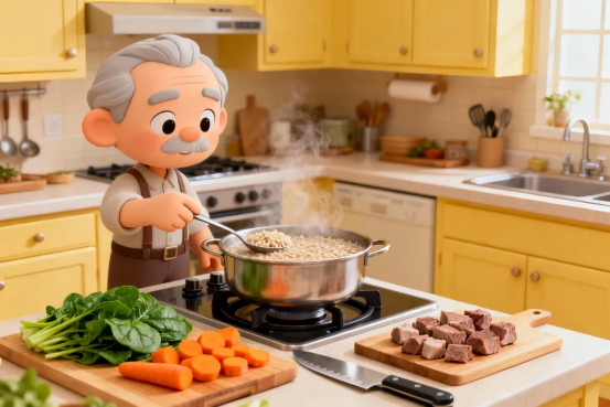 ②蛋白质优质易嚼:每日“1个鸡蛋+1杯温牛奶(或无糖豆浆)+1手掌心瘦肉/鱼肉”。优先选择清蒸鱼(刺少)、炖瘦肉(切碎)、豆腐(软嫩),避免油炸肉、带筋的肉,预防肌肉流失,提升免疫力。