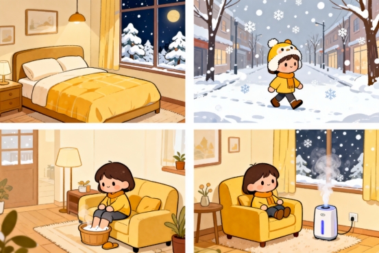 2、注意保暖:大雪时气温骤降,寒邪极易侵入人体。尤其要注意头部、颈部、脚部的保暖。头部是人体阳气汇聚之处,头部受寒,易引发头痛、感冒等疾病,因此出门最好戴上帽子。颈部受寒会影响颈部血管的血液循环,导致脑部供血不足,所以要围上围巾。脚部离心脏最远,血液循环相对较差,且脚部的穴位与人体各个脏腑相连,所以要穿厚袜子和保暖的鞋子,睡前还可用热水泡脚,促进血液循环,温通经络。