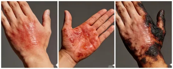 3、三度烧伤:这种烧伤是最严重的,损伤涉及到皮肤的所有层次,甚至可能影响到肌肉和骨骼。受伤区域可能呈现苍白、黑色或焦灼的外观,几乎没有疼痛感,因为神经末梢可能已经被破坏。这种烧伤需要立即就医。