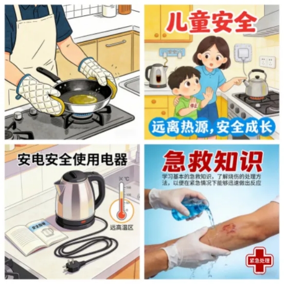 4、急救知识:学习基本的急救知识,了解烧伤的处理方法,以便在紧急情况下能够迅速做出反应。
