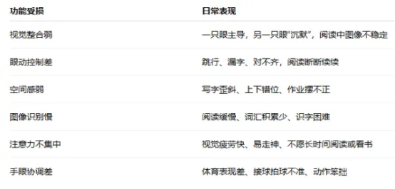 若双眼视知觉功能出现缺陷或障碍,复视、立体视丧失、视疲劳等问题便会接踵而至,还可能加速近视发展。尤其值得注意的是,患者可能出现注意力不集中、聚焦困难、远近视物模糊、字体跳动,甚至读写障碍等情况,严重影响日常学习生活。部分儿童青少年因此被误诊为多动症和学习困难。