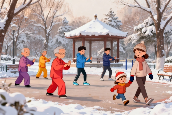 运动强度不宜过大。冬季阳气潜藏,过度运动易使阳气外泄、损伤正气。可选择太极拳、八段锦、散步等温和运动。太极拳动作缓慢柔和,注重整体协调,能调节呼吸、增强心肺功能与血液循环;八段锦作为传统健身功法,通过八个动作调节气血运行,增强柔韧性与平衡力;散步简单易行,可促进胃肠蠕动、增强消化功能,还能放松心情、缓解压力。