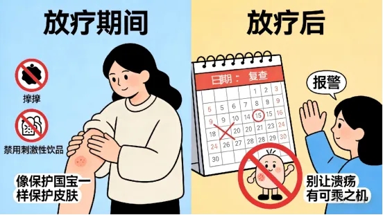 俗话说“最好的治疗是预防”,这句话对于慢性放射性溃疡来说同样非常适用。在放疗期间,大家要精心保护放疗部位的皮肤:穿宽松舒适的衣物,避免皮肤受到摩擦;千万不要使用刺激性的护肤品,以免给皮肤增加负担。放疗结束后,也不能掉以轻心,要定期去医院复查,一旦发现皮肤有任何异常情况,一定要及时干预,绝不能让溃疡有任何“可乘之机”。