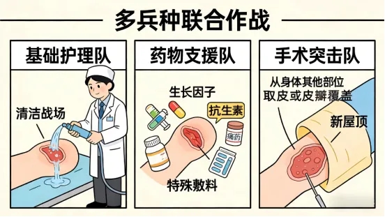 2.药物支援队:要是出现了感染情况,抗生素“士兵”就会奋勇向前,冲锋在对抗感染的第一线;要是患者疼痛难忍,止痛药“后勤保障”就会及时跟上,缓解患者的痛苦;此外,还可能会动用生长因子、高压氧等“特殊武器”,来促进组织的修复,帮助伤口“快快长肉”,加速愈合。