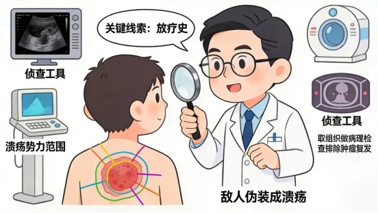 当患者拖着这“身体里的烂泥潭”来就医时,医生就会立刻开启“福尔摩斯模式”。首先,询问放疗史!紧接着,通过视诊和触诊初步判断溃疡的“势力范围”。随后,超声、CT、MRI 等“侦查工具”会轮番上阵,仔细查看有没有侵犯骨头、血管等“重要器官”。在必要的时候,医生还会取一小块组织去做病理检查,毕竟有些狡猾的肿瘤可能会伪装成溃疡的样子,这可不能掉以轻心。