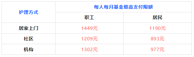 ②职工参保(含退休人员):基金支付约70%;待遇不设起付标准,基金不直接向失能人员发放现金,主要支付护理服务项目费用。基金个人年度最高支付限额不超过统筹地区城乡居民年人均可支配收入的50%。