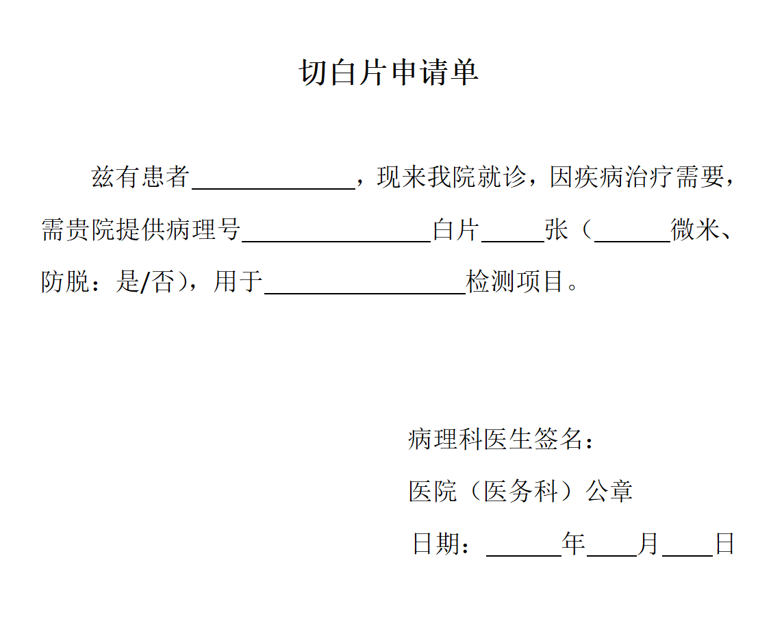 3.如需切白片,除提供以上材料外,还需提供外借医院(即请求借用切片的医院)开具的《切白片申请单》(模板下载见附件)。申请单须由外借医院病理科医生签名,并加盖医务科或单位公章(复印件不作为有效申请)。