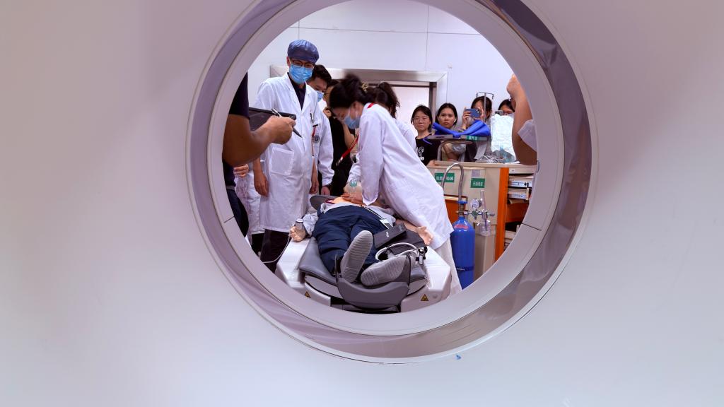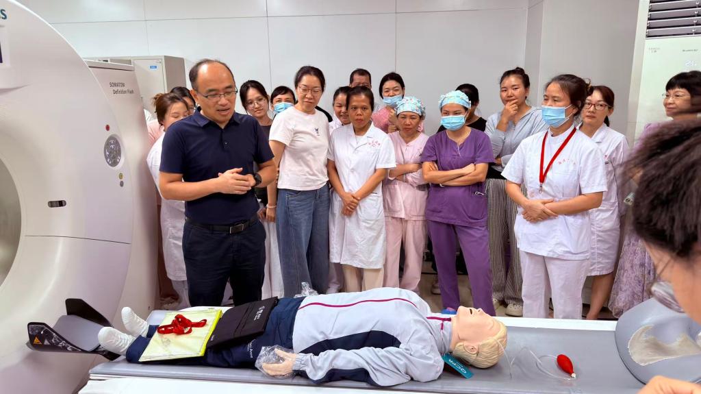 培训下半场在海南医科大学第一附属医院门急诊楼负一楼CT机房进行真实情景模拟演练。由放射科医师1人、住培医师、技师2人、护士2人组成急救团队,根据王西富主任给出的随机案例:患者男性,诊断为肺结节,在行CT增强过程中呼救,出现碘过敏反应,急救在大家的围观下紧张有序的拉开帷幕,王主任实时给出的患者病情变化指征,PAD实时显示患者生命体征及心电图波段,团队成员根据病情进展变化给予相应抢救措施,并真实联动急诊医学科医护到达现场进行患者救治配合,直至患者行气管插管环节,此次情景模拟救治也告一段落。
