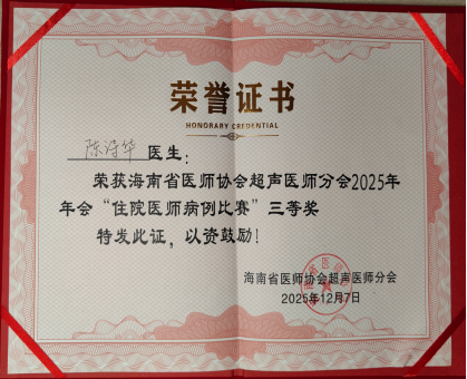 我院超声医学住培基地2023级学员陈诗华在12月7日海南省医师协会超声医师分会举办的住院医师病例比赛中凭借题为“声影探秘,探管取物——肝内肿物超声诊疗一体化病例”荣获三等奖。
