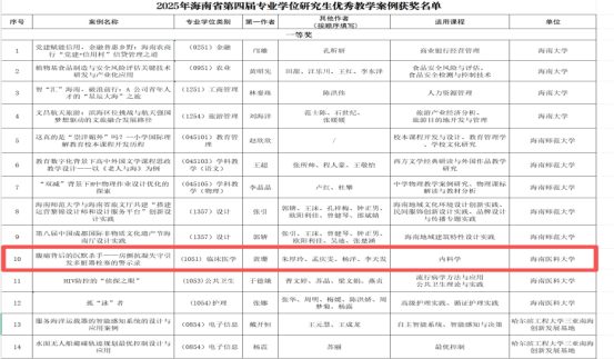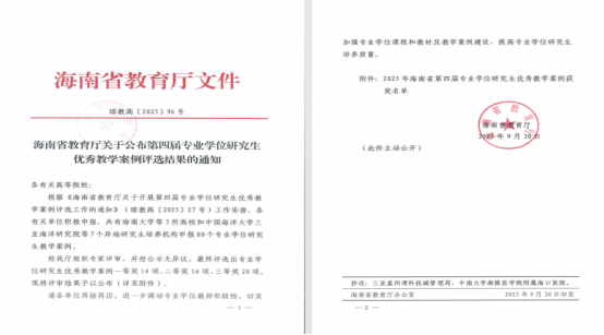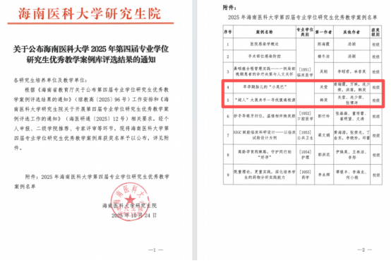 2025年9月,海南省教育厅公布第四届专业学位研究生优秀教学案例评选结果,我院黄珊老师团队撰写的案例《腹痛背后的沉默杀手——房颤抗凝失守引发多脏器栓塞的警示录》荣获一等奖。同时,在学校第四届专业学位研究生优秀教学案例评选中,我院韩笑老师团队的《“超人”大展身手——寻找腹痛的根源》和关莹老师团队的《早孕期胎儿的“小尾巴”》也获评为校级优秀教学案例。