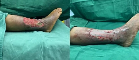 这一切始于一场车祸。当年的事故导致王先生胫腓骨粉碎性骨折,此后右小腿皮肤逐渐溃烂,形成20cm×15cm的陈旧性创面,局部胫骨裸露,反复感染。二十多年间,他多方求医,却屡次得到“只能截肢保命”的建议。直到今年春天的一个早晨,创面修复科程主任在查房时,细心发现创面边缘那圈不易察觉的粉红色肉芽——这意味着仍有愈合的可能。