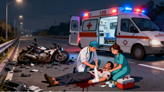 11月10日凌晨4时左右,29岁的吴先生驾驶摩托车时不慎发生高速撞击事故,全身多处严重受伤,意识模糊。接警6分钟后,属地交警与120急救车火速赶赴现场,同时启动警医联动系统。