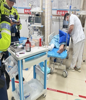 120急救医生现场包扎固定,输液,紧急救治并将伤情通过警医联动平台上报交警管理部门及海医一附院创伤二线值班医生,做好救治准备。15分钟后病人转到海南省创伤救治中心—海医一附院急诊和创伤外科。