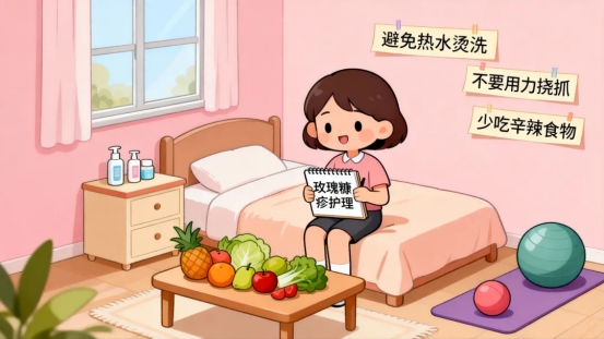 2、均衡饮食:少吃辛辣、海鲜、牛肉,不饮酒,多吃新鲜蔬果补维生素。