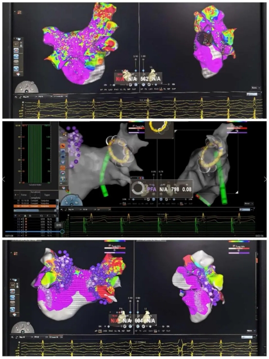 第四步:精准消融。利用多电极导管进行心房的术前基质标测,精细调整导管,并根据TPI贴靠提示精准到位并释放脉冲能量;术后再次标测基质并使用Grid点功能,保证左右肺静脉在电位和解剖两个维度均实现双侧肺静脉双向传导阻滞。整个左房操作仅用30分钟,消融时间20分钟,单支肺静脉隔离平均只要5分钟,效率远超传统手术。