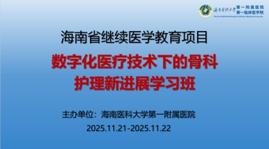 2025年11月21日至22日由海南医科大学第一附属医院脊柱外科主办的“数字化医疗技术下的骨科护理新进展学习班”在医院临床技能中心成功举办。本次学习班聚焦骨科护理领域的前沿技术与创新实践,为骨科护理同仁搭建交流学习平台。来自骨科各领域的骨干齐聚一堂,共同探讨数字化时代骨科护理的新机遇、新挑战与新未来。