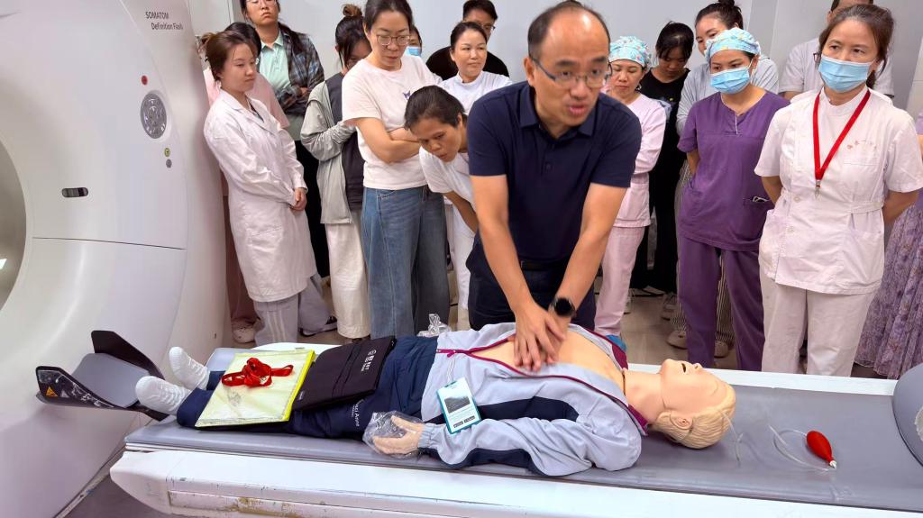 为提升放射科住院医师规范化培训学员的急救技能与应急处置能力,特别是应对造影剂过敏反应等放射科潜在风险;2025年10月16日,海南医科大学第一附属医院放射科组织了一场包括全体住培学员的心肺复苏(CPR)专项技能培训。此次培训邀请到广州市第一人民医院模拟医学中心主任、美国心脏协会急救BLS&ACLS课程导师、国际野外医学协会急救课程导师王西富主任,莅临授课及现场实景操作指导。王西富主任在住培学员急救培训有着丰富的教...