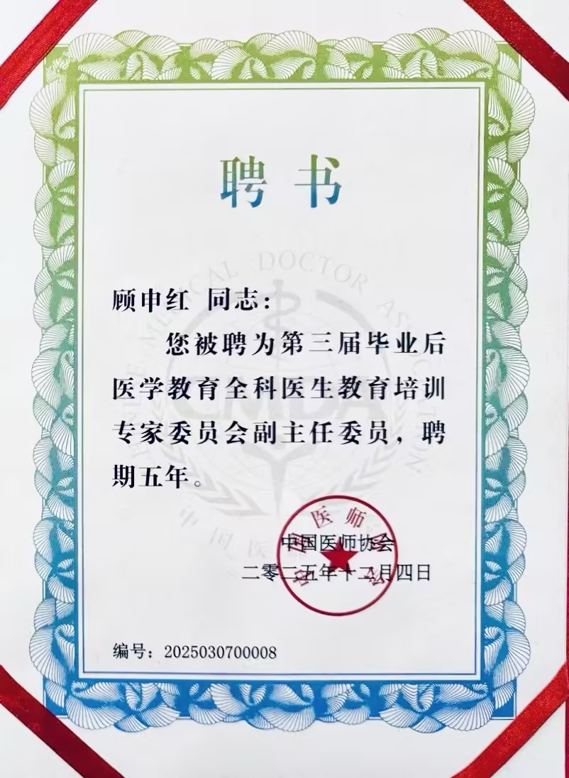 近日,我院全科医学科主任顾申红同志正式被中国医师协会聘为第三届毕业后医学教育全科医生教育培训专家委员会副主任委员,聘期五年。
