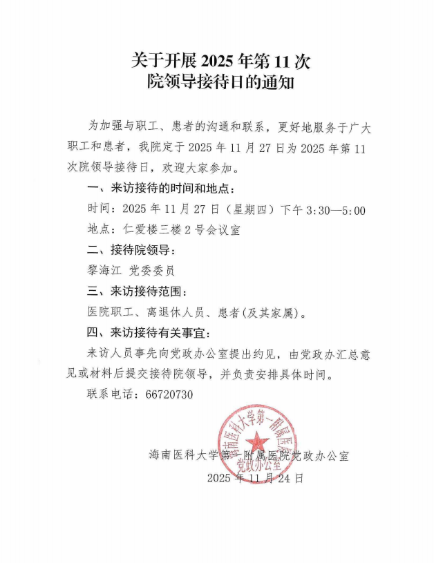 为加强与职工、患者的沟通和联系,更好地服务于广大职工和患者,我院定于2025年11月27日为2025年第11次院领导接待日,欢迎大家参加。