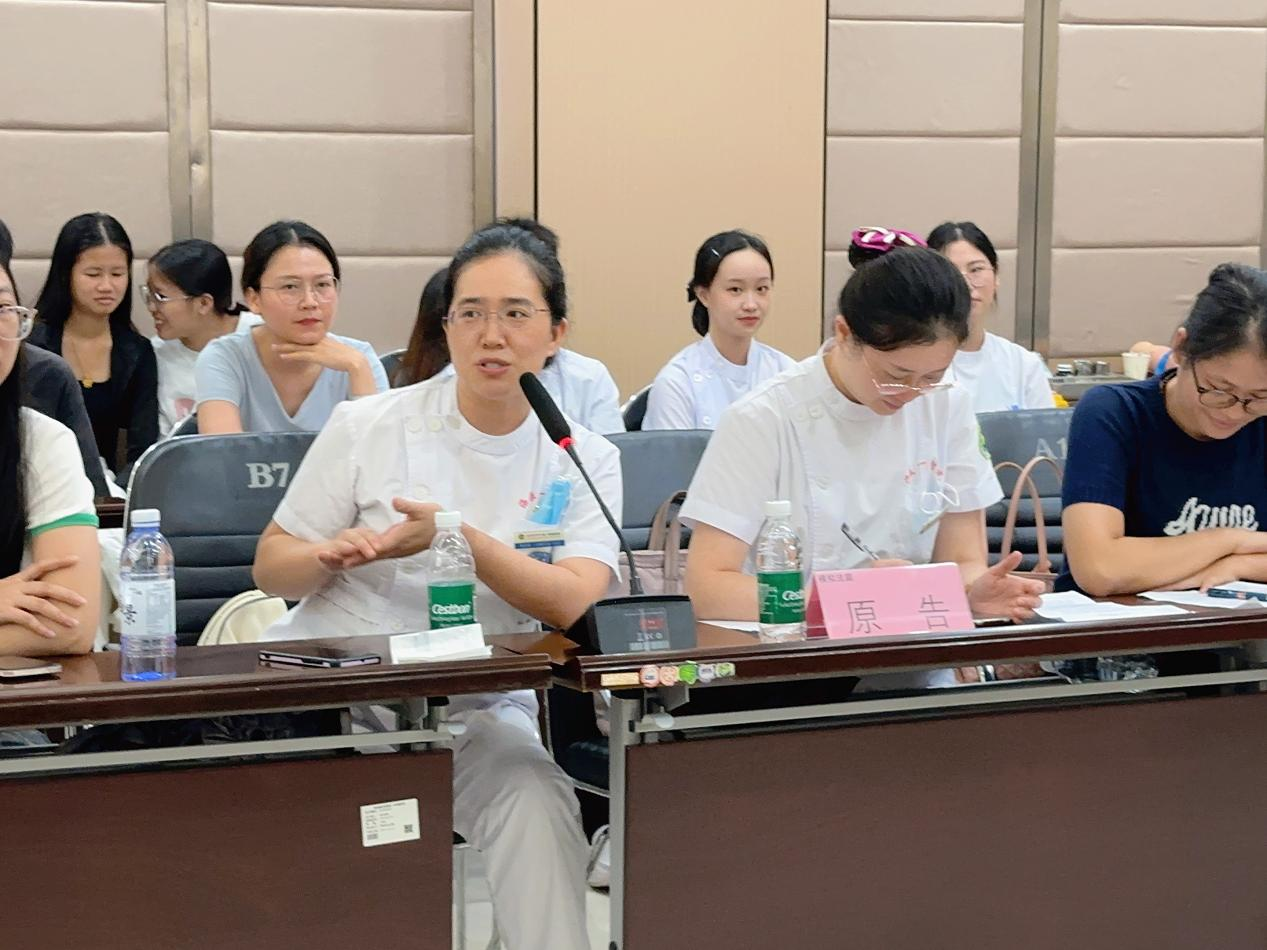 本次活动以“模拟法庭”形式展开,将真实的不良事件案例置于“庭审”场景之中,通过结构化、戏剧化的呈现方式,深入剖析事件背后的根本原因与系统漏洞。风湿免疫科、心血管内二科的护生团队担任“原告”角色,详细陈述事件经过;神经内科、普通外科的护生团队扮演“被告”,负责不同环节的答辩;系统科护士长、血液净化中心、神经外科、创面修复等科室的护生团队担任“大众陪审团”,负责现场提问。通过多方互动、层层推进,最终由护理部副主任张翔扮演的“审判长”宣布改进措施作为“判决结果”。这种创新形式不仅增强了与会者的参与感和代入感,更推动大家从系统层面深入思考问题本质。