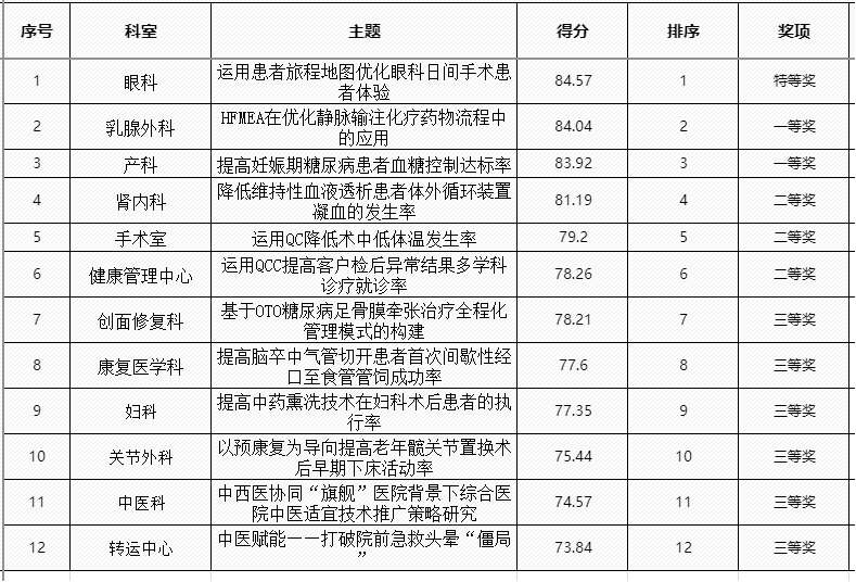 今年各临床科室共提交55项护理质量改进及质量管理工具应用成果,经初赛选拔,12项成果脱颖而出进入决赛。