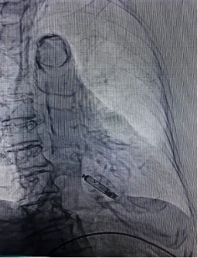 患者脊柱弯曲,血管走形迂曲,导管要跨越三尖瓣,每一步都像在迷宫中寻找通路。但凭借丰富的介入经验,团队利用可调弯鞘的灵活操控性,精准将起搏器送达预定位置。