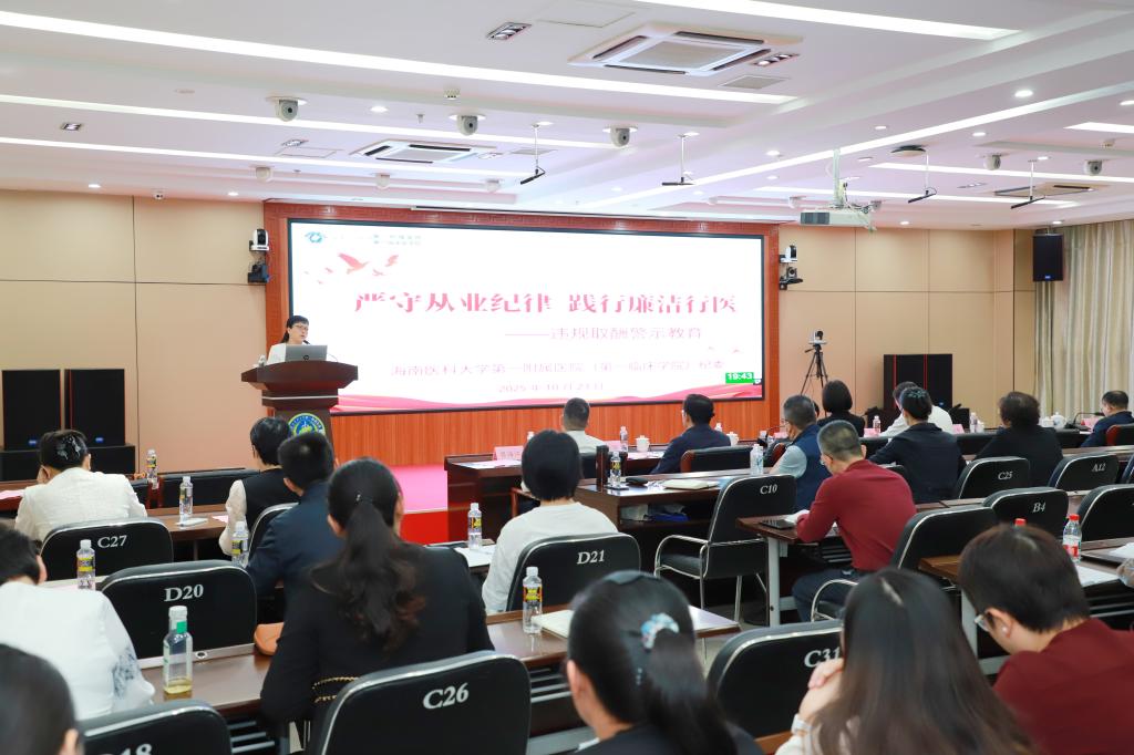 10月23日下午,我院召开专题警示教育会,校纪委副书记兼医院党委副书记、纪委书记肖红秀以《严守从业纪律践行廉洁行医——违规取酬警示教育》为题作警示教育报告,党委书记徐剑、院长李琪等院领导班子成员及全体中层干部参加会议。肖红秀结合法律法规及《医疗机构工作人员廉洁从业九项准则》,系统阐释了违规取酬的界定、常见形式及相应处理处分规定,深入剖析典型案例,强化警示教育效果。她围绕医院工作实际,就规范医疗服务...